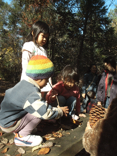 森の中の木漏れ日の色も、なんだか秋色。 落ち葉で遊んだり、ドングリを拾ったり。 実りの秋を楽しみます♪
